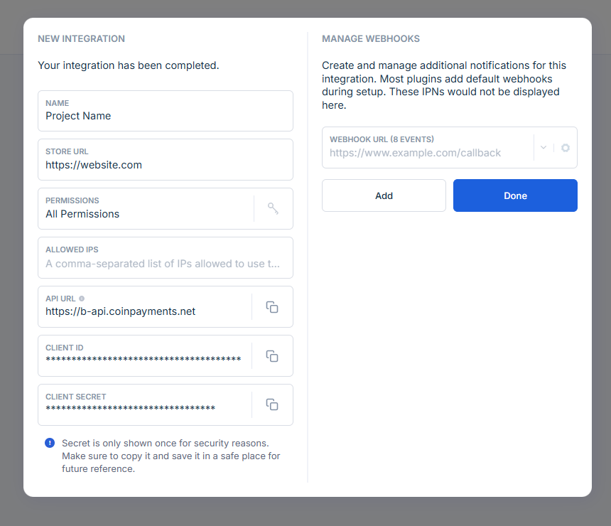 - Store these keys securely for use in your application. - Enter the API key and configure in